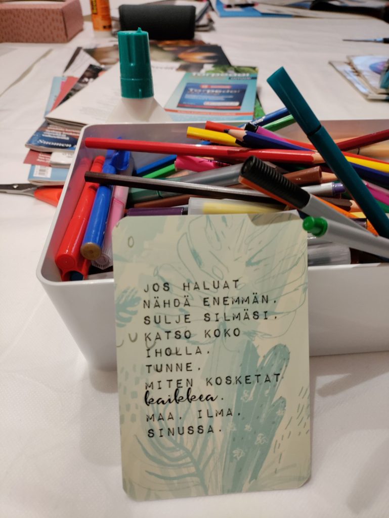 ”Tehtävät olivat oiken oivalluttavia. Pidin tehtävien annost. Rentoutushetket, musiikki ja kortit virittivät sopivaan mielentilaan. Kurssi vastasi toiveitani, VAikka joskus ei olisi jaksanut lähteä, niin joka kerta oli hyvä mieli ja aina kannatti lähteä-fiilis.